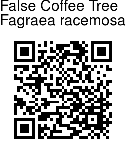 False Coffee Tree is a shrub or small to medium-sized tree up to 25 m tall, bole up to 30 cm in diameter. The leaves are opposite, have stout stalks, and very leathery, oblong or ovate, 15-33 cm in length, 8-18 cm in width, rounded or somewhat heart-shaped at the base, and pointed at the tip. The stipules from a cup around the stem on which the leaves are borne. The flowers are borne in clusters on terminal inflorescences which are often 20-30 cm in length. They have a white, funnel-shaped corolla about 2.5 to 3 cm in diameter, with 5 prominent lobes. Fruit is round to ellipsoid-ovoid, apiculate, bluish or greenish or red when ripe, about 1 cm in diameter.