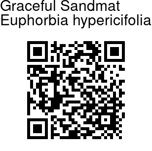 Botanical name:  Euphorbia hypericifolia    Family: Euphorbiaceae (Castor family) Synonyms: Chamaesyce hypericifolia, Euphorbia glomerifera, Euphorbia hypericifolia  Graceful Sandmat is an annual herb with milky sap. Stems are hairless,
